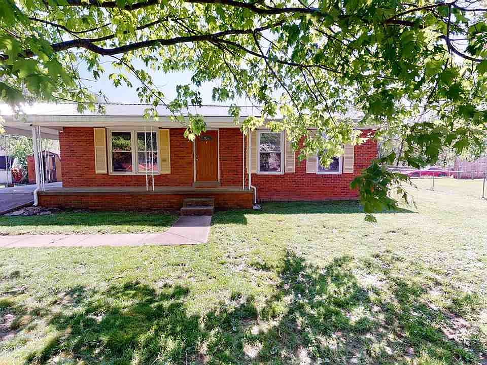 Very affordable brick and vinyl one-floor plan with a level, fenced yard! Spacious living room and dining room. Three bedrooms; two with double closets. The kitchen has access to the rear deck. Two full baths. Inviting, covered front porch. Carport with built-in storage plus additional storage building.