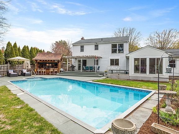 Welcome to 26 Meadowbrook Rd, Bedford—a private 1.5-acre oasis perfect for entertaining! This 3–4 bedroom, 2.5 bath home offers 2,563 sq ft of versatile living. Enjoy summer fun by the heated pool, complete with a pool house and tiki bar. Inside, an open layout includes a spacious family room (formerly an in-law suite) and a mudroom with plumbing for a potential full bath. Relax by the living room fireplace or unwind in the screened porch with sunset views over conservation land. Upstairs features 3 bedrooms with hardwood floors and an updated primary bath. A detached two-car garage offers extra storage or workspace. Tucked in a quiet neighborhood with easy access to Burlington and major routes, this home blends comfort, flexibility, and fun in a prime location. Your backyard retreat awaits!