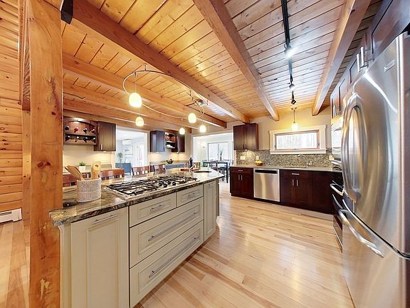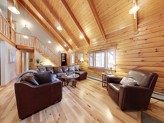 A mix of timber, glass & soaring ceilings showcase throughout this ALTA Pine Log Home. Flow through the LR & into the beautifully appointed Kitchen w/ natural stone, sleek cabinetry, large island & SS appliances opened to a glass encased DR. Main level offers a Full BA, office & BDRM along w/ a FR boasting a dominating stone accent wall w/ access to the backyard, 2nd level & hallway leading to laundry, mudroom & spiral staircase to lower level. Continue up to a sundrenched Master w/ a full ensuite & 2 entry points. Down the hallway find 3 addtâl BDRMS & Full BA w/ soaker tub. The basement is a multi-purpose room designed to be used any way you wish w/ separate storage space. The tour isn't over yet! Head out to the outdoor sanctuary w/ a hot tub off the composite deck leading to seasons full of fun in the inground heated pool! Backed by a mature tree line & fenced in privacy abounds here! Too many features/updates to list! A home built to retreat, relax & entertain!