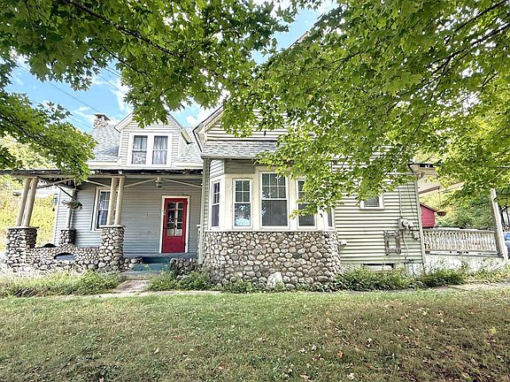 A $10,000 Price Improvement! This 1850 home is in a category all its own and offers some distant mountain views, a welcomed surprise for its village location. Character and charm abound with cobbled river stone details sprinkled around the outside and featured inside with the living room fireplace. There are built-ins galore and unique details to catch your eye. With too many to mention here, please look through the listing photos! Entering the home through the covered porch in back brings you through a small mudroom and into the kitchen. The formal dining space off the kitchen has a beautiful hutch for your dishes. A study has ample room for books with window seating for reading. The spacious living room has the unique fireplace and hardwood floors. A full bath with laundry rounds out the 1st floor. The living room stairs bring you to the large primary bedroom with access to a 3rd bedroom via a pass through 2nd bedroom. There's access from a kitchen stairway as well. This unique home is situated on a corner lot with plenty of room for gardens, as the current owners have taken full advantage of! The large outbuilding is open below, and has storage and power above. There's opportunity here to bring in your own tastes and colors to this vintage village home and mix the old with your new. Likely inspired by the Arts & Crafts Movement of the 1800's, the history is in the details, is something to see for sure, and might just be what you're looking for. Come take a look!