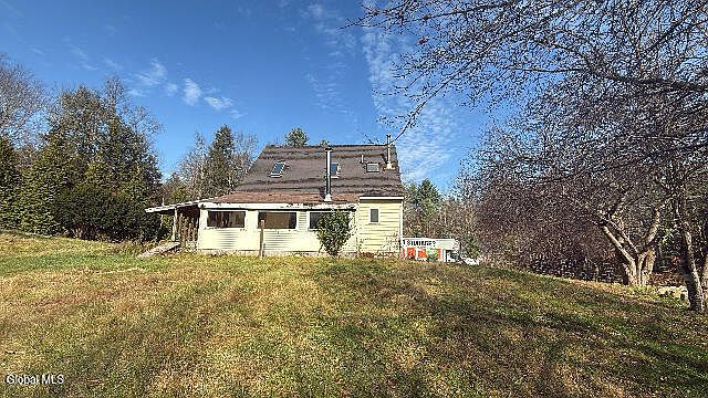 Home with lots of space and potential needing your sweat and ideas. Bright and sunny family/sunroom, lg eat in kitchen, hardwood floors, large living room and 1st floor bedroom with double closets. 1st floor laundry. 3 bedrooms upstairs or 2 bdrms and an office space. Basement level is a walk out and is also the 2 car heated garage . Long private gated driveway . Woostove and appliances not guaranteed.Cash or rehab loan only.
