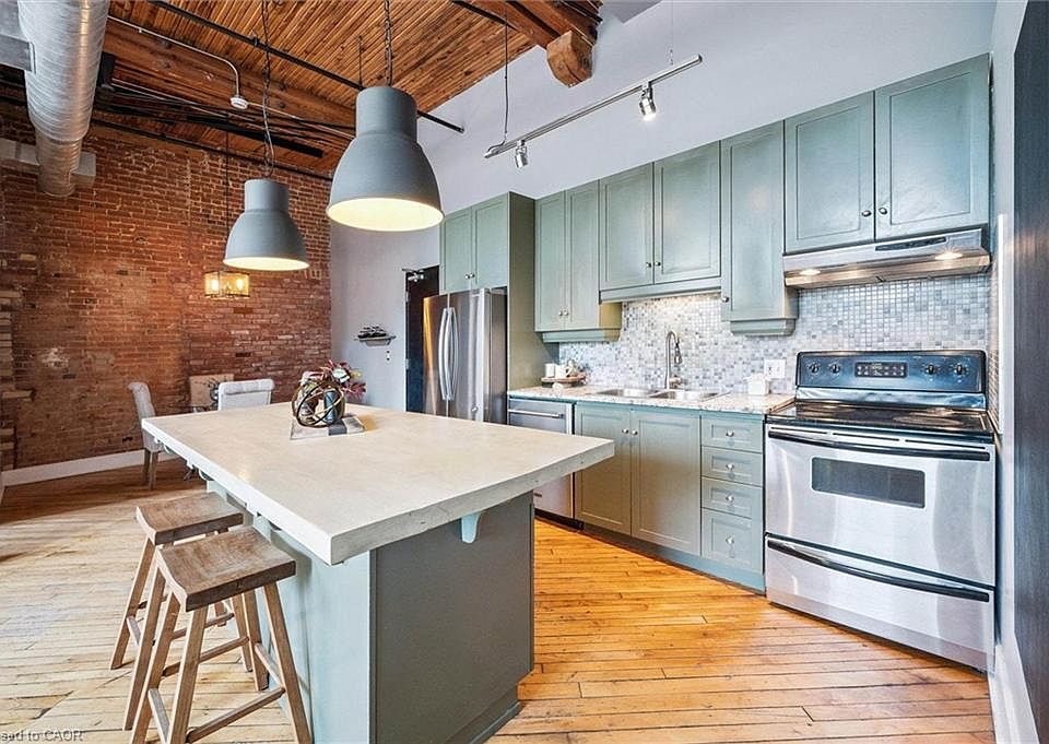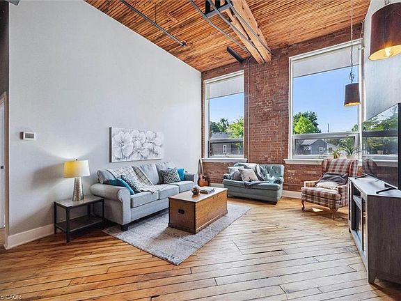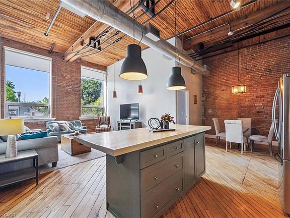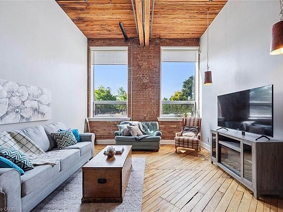 Discover rare industrial-loft living at 122–26 Ontario St, nestled in the luxurious Mill Lofts—formerly the historic Guelph Worsted & Spinning Company, circa 1902 & thoughtfully converted into boutique condos in 2004. This tastefully updated 2-bdrm loft offers the best of both worlds: modern luxury finishes paired W/preserved historic charm all nestled in the heart of downtown Guelph—just steps from vibrant shops & cafés. Step inside & be captivated by dramatic 13ft ceilings showcasing exposed old-world wooden beams & original brick walls found in nearly every room. Oversized windows bathe the open-concept living & kitchen space in natural light, highlighting the rich hardwood floors & enhancing the warm, welcoming ambience. Sleek & sophisticated kitchen W/quartz counters, backsplash, S/S appliances & centre island W/pendant lighting—perfect for casual dining & entertaining. The adjacent dining space, graced with its own brick feature wall & designer lighting, rounds out the sociable layout. Both bdrms feature hardwood, massive windows, exposed brick & lots of closet space. Completing this home is renovated 4pc bath W/quartz counters & subway-tiled shower/tub. With only 78 units in this boutique heritage building, opportunities like this don’t come up often! Unit includes in-suite laundry, 1 parking spot, locker & access to large detached party room—perfect for hosting friends & family. Main floor living means you get all the benefits of maintenance-free condo life—without the hassle of stairs or waiting on elevators. Embrace the best of downtown with a highly walkable lifestyle, just steps to cafés, boutiques, dining hotspots, nightlife & GO Station. Just a few doors down from Standing Room Only, Canada’s smallest bar & beloved local gem. For nature lovers, York Rd Park is right around the corner with picnic areas & sports fields, while the scenic Eramosa River Trail winds peacefully along the water—perfect for walking, running or cycling right from your doorstep.