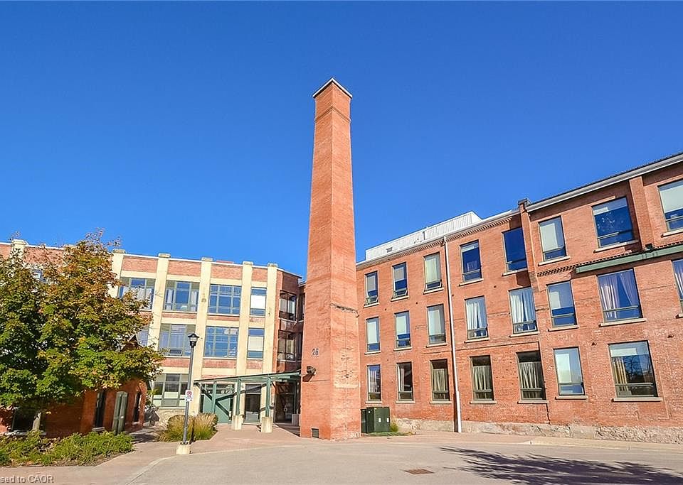 Welcome to an exquisite corner unit at The Mill Lofts centrally located at 26 Ontario Street in downtown Guelph. This luxurious and spacious end unit boast 1173 sq.ft. of finished living space and is truly a rare two storey unit offering. Beautifully finished top to bottom with exposed brick interior walls, hardwood flooring, exposed beams and luxurious finishes. The main level boasts a beautiful shaker style kitchen cabinet with glass front upper cabinets, granite countertops and backsplash, stainless steel appliances including a built-in dishwasher and microwave range hood and a centre breakfast island. Hardwood underfoot, the main area also has plenty of space in the designated dining area to accommodate a large dining table and more than enough space for an oversized couch or sectional in your living space which is all open to the loft and second floor above. A two-piece bathroom, storage closet and in-suite laundry closet complete the main level. The centre hall open staircase leads you to the second floor where you will find an open loft area. Many uses for this room include a home office, or home gym or set up the loft as a games room. This area is designed to fit your lifestyle. The primary bedroom overlooks the main level below and is equipped with a walk-in closet. The four piece bathroom and plenty of closet storage complete the second floor. The exposed brick interior along with the oversized windows and exposed beams produces a dramatic and classic look, that result in a luxurious condo that brings back the century-old industrial architecture of the original iconic 1902 spinning mill building. Located in downtown Guelph, steps from scenic trails, the GO Train, vibrant shops, restaurants and all the amenities you require. Enjoy access to a private entertaining building for your special private gatherings. Don't miss out on this corner unit layout. Historic charm, and premium location make it truly a rare find. Call today for your private viewing.