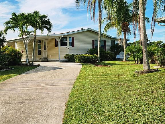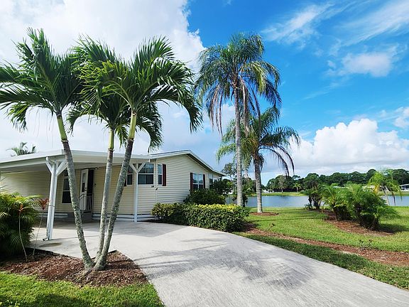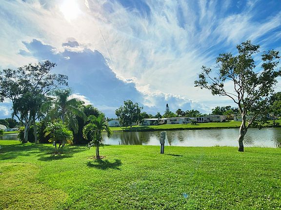 Natural beauty surrounds this 2bed/2bath home, nestled in the back of a CulDeSac on a large corner lot w/ panoramic lake views.Watch ducks & wildlife glide across water & colorful evening sunsets in large window/screened in Florida Rm. Expansive lot offers privacy & space, great for pets, gardening, grilling, entertaining, or soaking in peaceful surroundings. Recent updates include a 2020 roof, 2023 AC & 2022 carpet/flooring, WaterHtr 2020. PRIME LOCATION; near beach, grocery stores, post office, banks, hospitals, pharmacy & more! Lot rent of 1080.98 includes private golf course (no fees to play) heated pool, fitness, pickleball, tennis, shuffleboard, bocce, gym, library, card games, MahJong, Bible study, wood workshop, parades, dinners, dances, trips & more! Lawn cutting & trash included