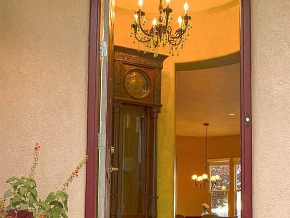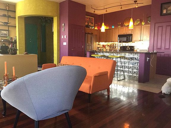 Unique artists' pueblo contemporary home on quiet corner lot; views to the east, south and west. Large windows for lots of light, mature maintained landscaping, hardwood floors in living areas and upgraded tile in the kitchen with quartz island counter.