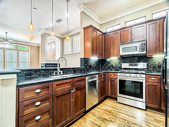 Perfect Location! Corner unit townhome located in heart of The Woodlands Town center...walk to The Waterway, Pavilion, shopping and dining. Beautiful open floor plan with great natural light with custom finishes including gourmet kitchen with stainless steel appliances, granite, 12' ceilings, huge game room with full bath on third floor. Features include hardwood floors, marble in master bath, master with balcony and coffee bar and plantation shutters. Call for your private showing today!