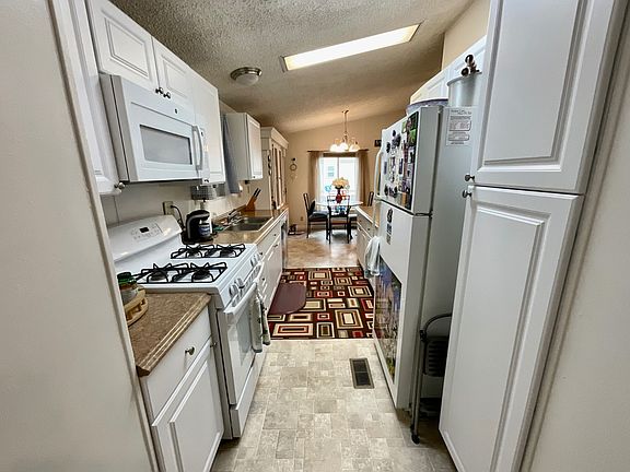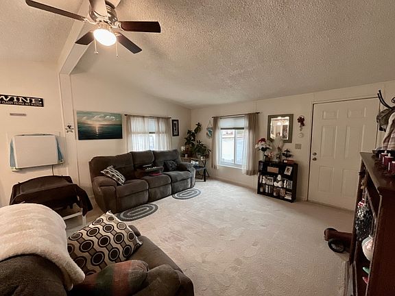This well-maintained home offers a bright and inviting layout designed for comfortable living. The vaulted ceiling enhances the open feel of the main living area, creating a spacious gathering space that flows seamlessly into the dining and kitchen areas. Textured walls and neutral tones provide a warm and modern backdrop for a variety of décor styles. The dining area features a large picture window and a built-in hutch, offering both storage and display space. The kitchen provides ample counter top room and convenient access to the main living spaces. Most of the windows in the home have been replaced and there are newer floors throughout home. Both bedrooms are nicely sized, with the primary bedroom offering a generous closet. Each bathroom is bright and clean with plenty of space to get ready. This home is in a community near dining, park areas, shopping.