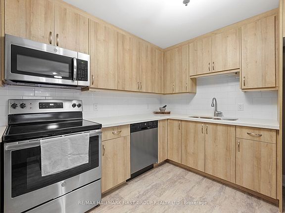 Low maintenance lifestyle in this renovated, modern style 1 bedroom + den condo apartment. Enjoy a large kitchen with quartz countertops, an abundance of cupboards & breakfast bar overlooking dining area & living room combination with low maintenance laminate floors throughout. Oversize windows, a functional primary bedroom and den that could be used as an office or storage. The modern 4pc. bath and 1 parking spot complete this offering. Centrally located close to Hwy 401, VIA rail, shops & walking distance to the beach. Access to the shared back patio & coin laundry on the same level. Economical to operate with water included.