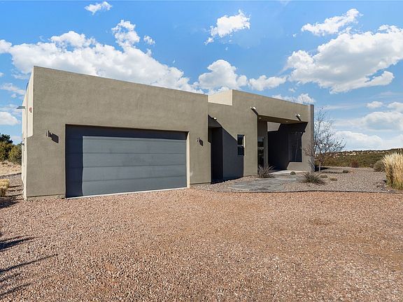 Set against the timeless landscape of northern New Mexico and beautiful views of the Jemez and Sangre de Cristo Mountains, this inviting home on 2.6 acres blends classic Santa Fe style with comfortable modern living. Enjoying a private but convenient setting in the desirable Sundance Ridge subdivision off of Tano Road, this home consists of just over 2,400 sq. ft. of living space, configured as 3 bedrooms and 2.5 baths. The 5-year old home has a wonderfully open floor plan with high ceilings, which give the home a wonderful sense of light and space. The well appointed kitchen with Bosch appliances has great storage and counter space with an enormous island with plenty of bar seating, a large pantry with skylight and there is excellent separation between the guest bedrooms and primary suite. A wall of windows on the west side of the home looks out to the ample back patio with gas hookup for a grill, walled garden and lawn for unparalleled indoor/outdoor living. Enjoy the serene surroundings, big sunset views and dark night skies! All of this less than 15 minutes to the nearest grocery store, and less than 20 minutes to the Santa Fe Plaza!
