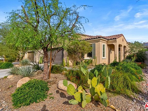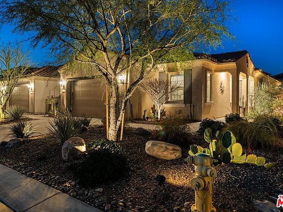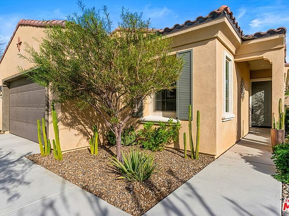 Welcome to 26 Syrah, situated in Phase 1 of the highly sought-after Del Webb Rancho Mirage, a 55+ gated community. This Expedition model boasts 1,770 square feet, a 2-bedroom, 2-bath home. As you enter this home, you'll see that there's nothing to do but move in. In excellent condition, ready for your design style and tastes. Beautiful porcelain flooring is featured throughout the house, with carpeting in the bedrooms. The kitchen is a chef's delight, featuring granite countertops, a walk-in pantry, and a laundry room located right off the kitchen. The primary is spacious with an upgraded barn door as you enter the en-suite. The bath features a luxurious walk-in shower with a convenient bench, ensuring a spa-like experience. There is a generous guest bedroom, as well as a third room that can be used as an office or a bedroom. This guestroom features a walk-in closet, fantastic for added storage space. When you look out at the landscaped backyard, you feel as though you are in a spa, a feeling of entering a calming home. It's a must-see. Leased Solar