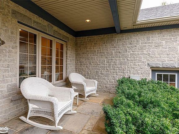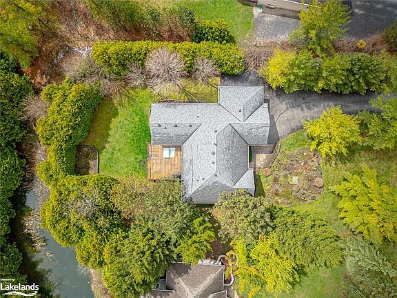 Paradise in Collingwood – a beautiful, custom-built family home surrounded by greenspace. Enjoy shared ownership of a 6+acre parcel of private forested land with trails, a pond, and the sparkling Silver Creek. If privacy is what you seek, it truly doesn't get any better than this. Sip a morning coffee on the front porch, listen to the birds, watch the world go by without the world watching you. You will be struck by the quality of craftsmanship; custom built by local builder Peter Schlegel, this is no cookie-cutter home. The great room has soaring vaulted ceilings and large, bright windows, including custom Georgian-Bay inspired stained glass. This entertaining space features built-ins and a double-sided gas fireplace shared with the kitchen, adding warmth and charm on cool evenings. A convenient den or office offers inspiring views and natural light. Designed for entertaining, the open kitchen/dining space offers ample storage with solid wood cabinetry and stone counters. A large primary suite features vaulted ceilings, an ensuite, and is positioned for complete privacy. Two walk-outs to your backyard oasis lead to a large deck with a hot tub surrounded by lush gardens and trees. This pool-sized yard is ideal for relaxing and hosting, surrounded by greenspace. A bungalow means a large basement, and this one is extra special with two additional bedrooms, a full bath and a mud room with access to the garage. The huge bonus space is ideal for entertaining offering a pool table and a custom-built, temperature-controlled wine cellar, heated floors and soundproofing between upper and lower levels. A triple garage with access from both floors keeps your cars and toys tucked away safely. This home is close to everything – skiing, golfing, restaurants, and wineries are minutes away. Enjoy the very best of the four-season living that Collingwood provides, and make some remarkable new memories in this fabulous home!