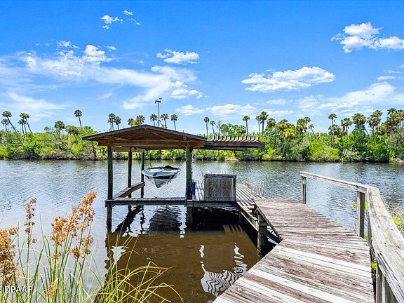 One-of-a-Kind Riverfront Retreat in The Trails! Tucked away on a private street in the highly sought-after Trails Subdivision, this stunning 4 bedroom, 3 bath riverfront home offers a rare blend of character, privacy, and breathtaking views. Set on over half an acre in a peaceful, park-like setting, this property features a private dock that leads to a charming riverhouse with a boat lift—offering direct access to the Intracoastal. Inside, the main level impresses with soaring tongue-and-groove wood ceilings with exposed beams, large picture windows framing gorgeous river views, a spacious living room, and a sunken family room with fireplace for cozy gatherings. The updated kitchen boasts granite countertops, stainless steel appliances, and a breakfast bar, while the formal dining room opens to a serene private courtyard. A guest bedroom and full bath complete the first floor. Upstairs, you'll find three additional bedrooms and two full baths, including a private master suite with a walkout balcony overlooking tranquil wooded river views. The master features a walk-in closet with built-ins and a beautifully appointed en-suite bath. Outside, unwind on the expansive deck or follow the wooden pathway down to your own riverfront escape. With a 3-car garage and unmatched views, this home is truly a rare gemperfect for those seeking peace, privacy, and waterfront living in one of Ormond Beach's most desirable communities. Square footage received from tax rolls. All information recorded in the MLS intended to be accurate but cannot be guaranteed.