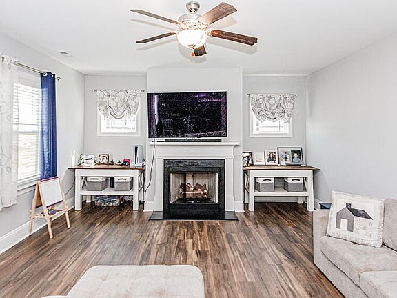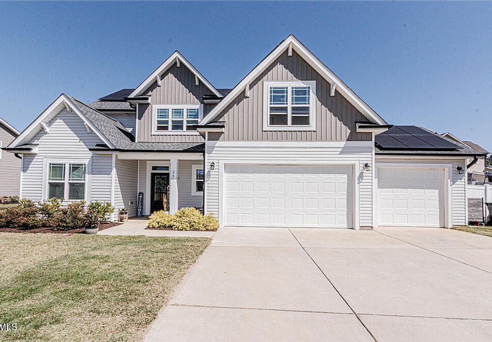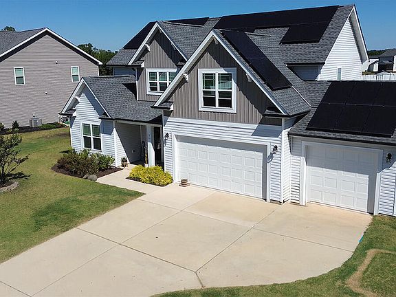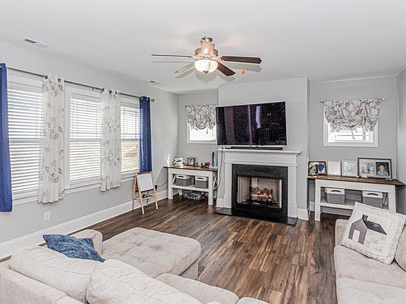 Welcome home to this 3-bedroom, 2.5-bath property on a spacious corner lot with room for everyone to enjoy. The first floor offers a home office, a formal dining room with tray ceiling, and a kitchen with plenty of cabinets, a large island, and refrigerator included. The family room features a warm gas log fireplace, perfect for gatherings. Upstairs, you'll find a loft with a barn door, an owner's suite with tray ceiling, walk-in closet, double vanity, soaking tub, and separate shower, along with two additional bedrooms. The large fenced yard extends beyond the fence, trampoline and swing set convey, making it move-in ready for lots of fun. The 3-car garage provides plenty of parking and storage, and solar panels help with energy savings.