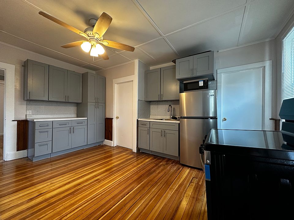 Modern kitchen: new appliances, sleek countertops, ample cabinets
