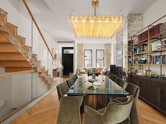 Upon entering through the snow melting radiant-heated stoop, you’ll immediately notice the sense of grandeur, highlighted by 11.5’ ceilings and deep floor plates reinforced with steel beams and joists. The parlor level features a marble gas fireplace, Graf engineered hardwood chevron-patterned flooring with warmboard aluminum radiant heat panels, and a stunning chandelier that enhances the elegant design.