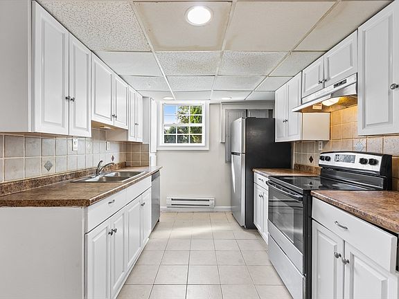 Easy-care white tile flooringClean move-in ready interiorNice with hardwood floors