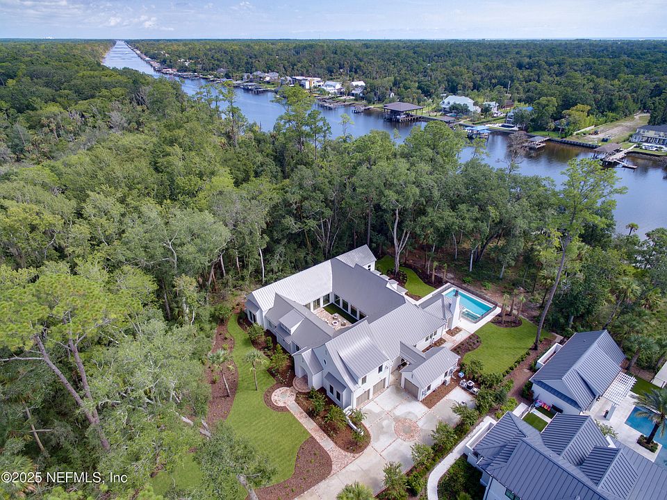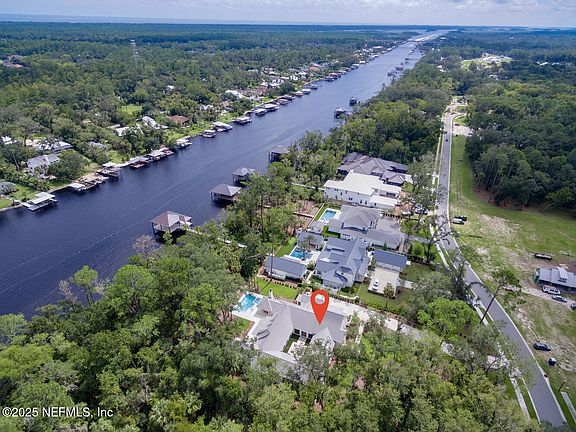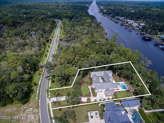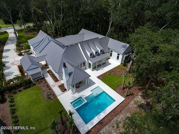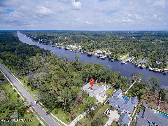 A stunner from the moment you pull in the driveway and located in the gated golf cart community of River Landing. A sanctuary for nature enthusiasts, this residence features direct access to the Intracoastal Waterway. Boasting 150 feet of waterfront and neighboring a protected preserve, this home guarantees remarkable privacy. The stunning 900-square-foot glass atrium serves as a captivating focal point, inviting you to transform it into an exquisite garden, a custom fire pit, or your personal retreat. The new construction by FaverGray Homes spans 6,647 square feet, the semi-custom design includes five bedrooms, four full bathrooms, and two half baths. The open-concept layout connects the kitchen, dining area, and family room harmoniously. The chef's kitchen is outfitted with three ovens and a convenient pot filler, offering effortless access to the covered outdoor living area featuring a fireplace and a saltwater pool. A spacious butler's pantry enhances functionality. Prewired for a generator and plumbed for a water softener. The owner's suite is complemented by a luxurious bathroom featuring a wet room and convenient access to one of the outdoor showers. Design for the owners closet is left up to the buyer and is a buyer's expense. A conveniently placed half bath serves the pool and outdoor living space while connecting to the single-car garage. The residence is crowned with a standing seam metal roof and includes an oversized laundry/craft room. A brief, enchanting stroll amidst a modest array of magnificent trees offers a perfect canopy of shade, guiding you to the serene waterway and the site of where you can build your personal dock. Dock and boardwalk to be designed and paid for by the buyer. Permit for a 30' dock transfers with the sale of the home. The home is adorned with engineered white oak flooring and tile throughout, while reclaimed barn beams enhance the charm of the family room and hallways. Stunning tongue and groove-stained wood ceilings grace the main hallway and owner's suite. Featuring two outdoor showers, as well as a double and single-car garage. This luxurious abode was meticulously designed by Cronk Duch Architecture. Drawing inspiration from the harmonious aesthetic of Alys Beach and the elegance of Mediterranean Revival architecture, blending these influences into a modern coastal aesthetic that creates a unique and refined, elegant style of its own. Nestled within the prestigious gated community of River Landing with low HOA dues, this property grants access to the abundant amenities offered by Nocatee. Interior finishes selected by Nesting Place Interiors.