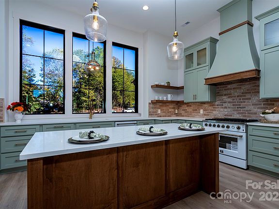 The custom kitchen is a true showpiece — offering 7-foot-tall windows above the sink that flood the space with light and overlook the outdoors. Enjoy stylish gas range with 6 burners, matching appliances, an oversized island ideal for entertaining, quartz countertops, sleek cabinetry, and a hidden walk-in pantry that keeps the design clean and functional.