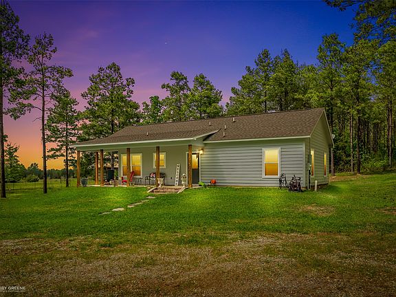 An outdoor paradise with modern amenities awaits you with this stunning property! Located on nearly 50 acres of land, this property features plenty of forested area, a gorgeous view over the adjacent pasture to the pond, a large recreational fire-pit with electricity to the pad, plus 2 long term deer leases located to the north (80 acres) and east (60 acres) of the property! The beautiful wrap around porch offers plenty of space to relax and enjoy the natural scenery, while the French doors leading into the heart of the home allow you to appreciate the views from inside as well. The open floor plan feels bright and airy with the wall of windows and vaulted ceiling. The modern kitchen features granite counters, stainless appliances, and a large center island, perfect for hosting gatherings! The three bedrooms are spacious and with two full baths, there is plenty of privacy and convenience for both family and guests. This land is perfect for hunting, enjoying nature, or maybe even cultivating your own garden! You truly need to experience all that this property has to offer in person, so don't wait and schedule your private tour today!