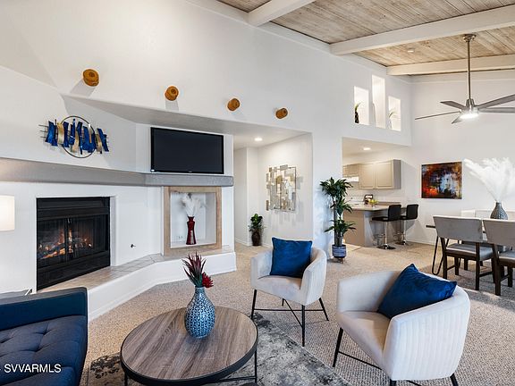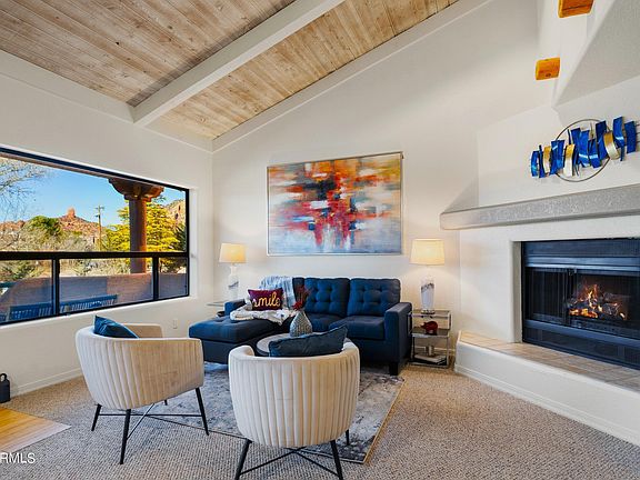 West Sedona 2 bedroom 2 bath condominium with RED ROCK VIEWS and a fenced backyard lush with trees and greenery offered for under $525K. 5 minute walk to the Sedona's famed Hwy89A offering restaurants, movie theaters, and shopping this wonderful architecturally pleasing 1404 square foot condominium is rich in details offering high wood beamed ceilings, niches, a gas corner fireplace, and picture windows! A Design that doesn't go out of style! Enjoy those red rock views from the living, dining rooms and the front deck! Kitchen offers loads of cabinets and a breakfast bar. Primary Ensuite spills onto a darling back deck overlooking a fence back yard brimming with trees and shrubs. Perfect for Fido or planting a small garden. Since this is 1 of only 4 end units, extra privacy abounds! Added features include Walk in Closets in both Bedrooms, Hall Walk in Pantry, new ceiling fans, and complete interior including garage just freshly painted! Lower Level offers a laundry area, office or exercise area, laundry closet, mud sink, 1 car garage, utility room storage area and underneath storage area! Low monthly HOA fee of $200.00 includes private seasonal pool, covered picnic area with grills, landscaping for the complex, trash service, roof coverage and exterior paint. 30 Day Minimum Rental in Association. Need a 2nd home that doesn't break the bank? Looking to relocate to Sedona to a place that doesn't break the bank? Buy now and hold. Buy now and rent. Just buy it now!