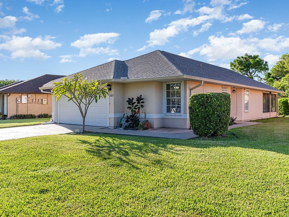 Exceptional 2 bedroom, 2 bath, 1215 living sq. ft., 1 story home. Spacious living-dining area with slider to screened patio. Office/bonus area with two skylights! Kitchen with breakfast nook and pantry. Primary bedroom with slider screened patio. Primary bathroom with walk-in shower. Screened patio with view to the lake. Laundry in garage with utility sink. Two car garage. Community pool, playground & jogging trail. Lawncare by HOA. Renters Insurance Required. RE/MAX Elite