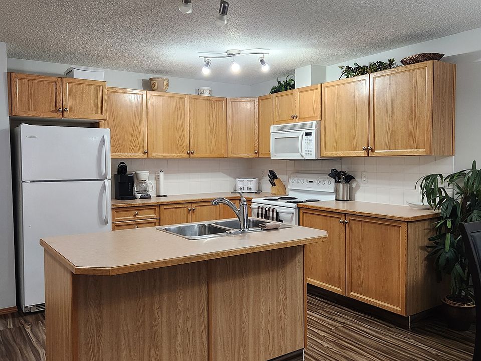 This spacious two bedroom plus a den suite will impress you with features such as an open layout, private balcony complete with gas BBQ hookups and in-suite laundry. Stepping inside, you will notice the meticulously maintained interior with beautiful vinyl plank flooring. The kitchen features gorgeous oak cabinetry, ample counter space, four appliances and fully equipped for cooking your meals. The spacious living room provides lots of natural light and features a gas fireplace to cozy up with on those chilly nights. The primary bedroom features a queen bed complete with bedding and your own private ensuite. Your second bedroom also features a queen bed, complete with bedding and the den provides versatility, whether it be for family, guests or a home office. Finishing off your suite you'll discover the 4-piece bathroom and the convenience of your own IN-SUITE LAUNDRY.