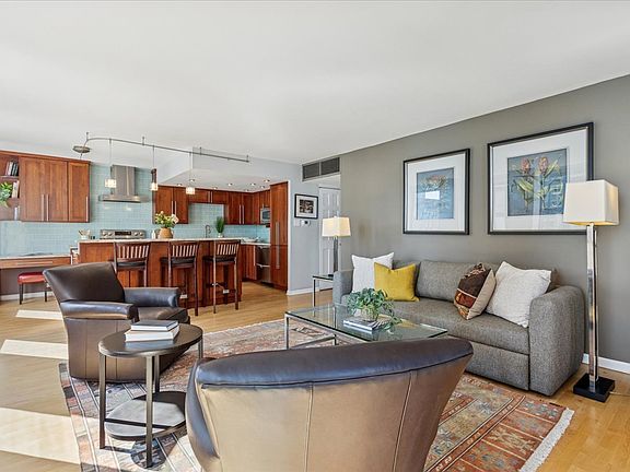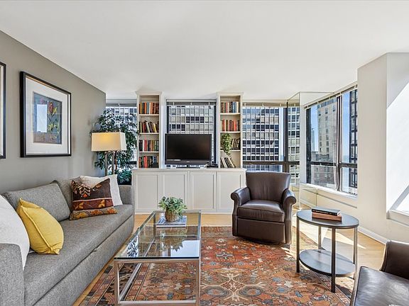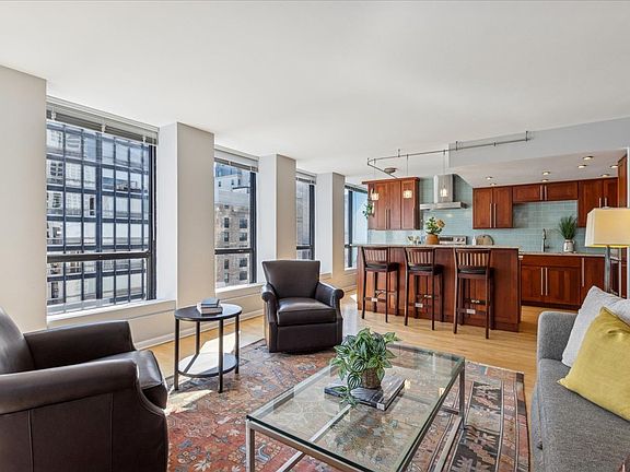 Step into this bright and inviting one bedroom, one bath residence where walls of northeast facing windows fill the home with natural light and frame stunning views of Lake Michigan. The thoughtfully designed layout offers exceptional storage, including wall to wall closets in the bedroom along with two additional hall closets for coats and linens. The open concept kitchen and living area creates a seamless flow for both entertaining and daily living. A chef's delight, the kitchen has been reimagined with sleek stainless steel appliances, a rare side by side double drawer refrigerator and freezer, a matching drawer style dishwasher, and a charming built in planning desk for added function. Building amenities include an expansive sundeck with views of the city and Lake Michigan, outdoor pool, party room, on site management and maintenance, well appointed fitness center and yoga/cardio room, receiving room, bike storage, valet parking, and more. With its modern updates, smart design, and captivating lake views, this home is as practical as it is beautiful, making it a true standout at the iconic Plaza on DeWitt.