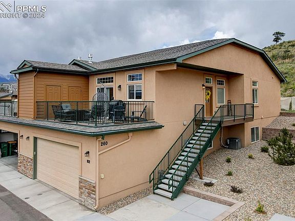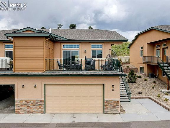 Stunning Luxury Townhome on the sought after west side of town. This raised ranch floor plan allows access from the main level or from the upper, with the upper walking into the main living, dining and kitchen area. The living area is centered around a beautiful fireplace making it ideal for those blustery fall and winter days and walks out to the stunning balcony with sweeping mountain views. The kitchen boasts a barstool height breakfast bar, stainless steel appliances, a gas range, and more stunning views out the window by the sink. Down the hall of the upper level the spacious master bedroom offers a restful sanctuary as you enter through double doors and can walk out to the back patio for some peaceful coffee in the morning. The ensuite bath is just as alluring with a large bathtub to soak the day away, a standalone shower, double vanity, and grand walk in closet. Lastly the upper level has bedroom number two and another full bath. Downstairs to the main level a beautiful family room makes space for myriad entertainment purposes, with an added nook that is currently being used for some exercise equipment. The main level hosts bedroom number three with a large walk in closet and a full bath just across the hall. This beautiful townhome has everything you may want and need and is just minutes away from some of the best hiking and biking trails, a top rated spa and salon, shops and restaurants including the award winning Cowboy Star. If you have desired a great community with easy access to I25 and all that Colorado Springs has to offer this luxurious townhome community is ideal.