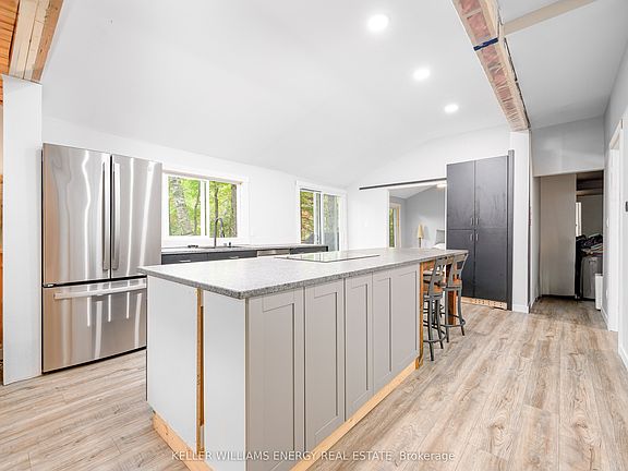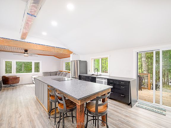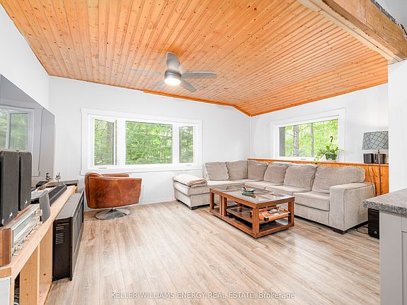 Stylishly Updated Inside and Out, so groovy! Dont miss this private oasis with 108 feet of frontage on the beautiful Miskwaa Zibii River. This charming year-round 3-bedroom, 1-bathroom home offers the perfect blend of comfort, serenity, and natural beauty. Inside, you'll find vaulted ceilings, tongue-and-groove pine throughout, 200-amp service, and an updated bathroom. Recent upgrades include all new insulation, plumbing, and wiring on the main floor, a new water treatment system, and washer/dryer. Step outside to enjoy a metal roof, drilled well, landscaped lot, private fire pit, and patio doors leading to a brand-new deck (2023) ideal for dining al fresco or hosting friends and family. The versatile bunkhouse, already equipped with 60-amp electrical, is ready for your finishing touches whether you envision extra guest space, a workshop, games room, or an artists retreat. Offered fully furnished and move-in ready, this home is perfect for your personal enjoyment or as a proven Airbnb investment with fantastic potential. A great location, countless updates, and serene river frontage make this property a rare find!