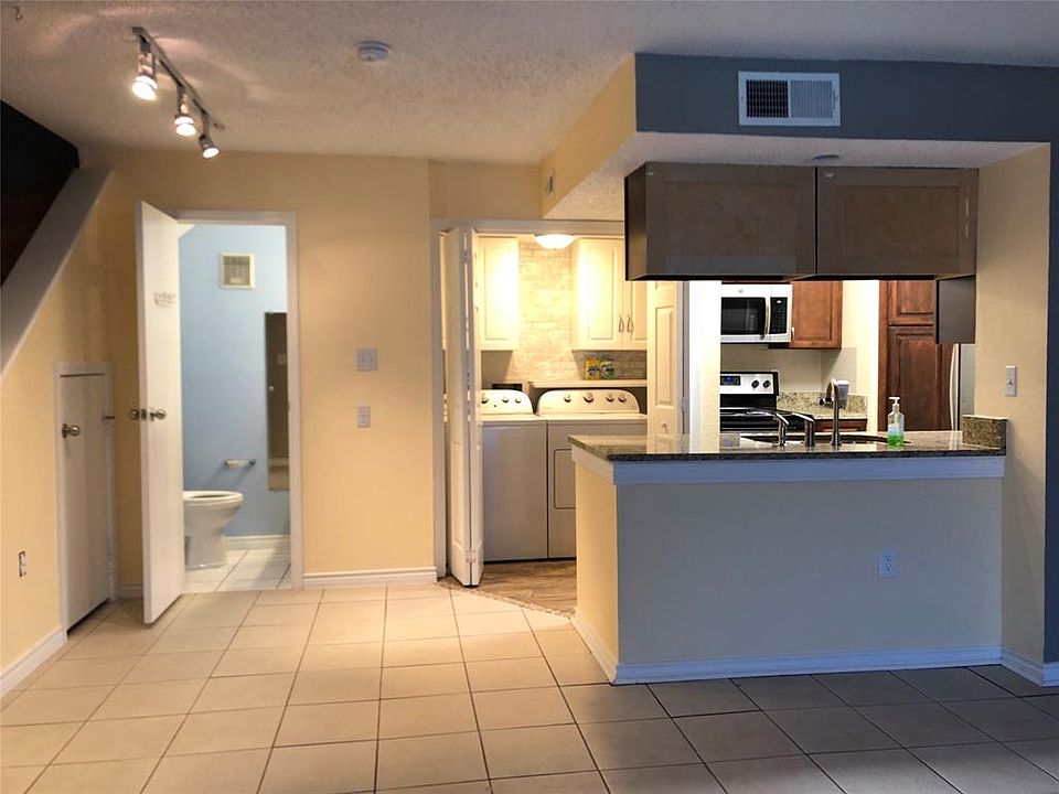 Awesome 2 story 1 Bed 1.5 bath with Chimney, Washer/Dryer/Refrigerator. Updates galore include Cabinets, Tile, Laminate, Granite, AC(for lower bills), Toilet, Vanity, Paint, Built-in Bookshelves and more... This is one beautiful place! 2nd Story Balcony & 1st Floor porch overlook the Nice pool. Step out your front door & cool water ios merely steps away.