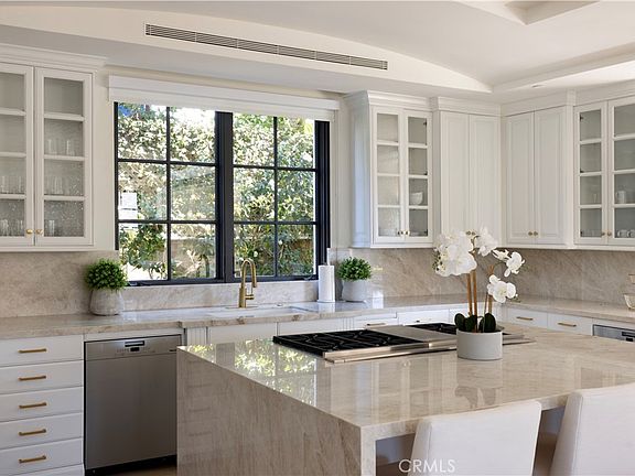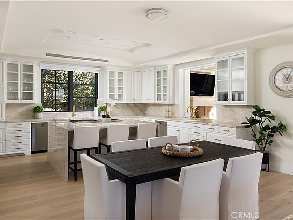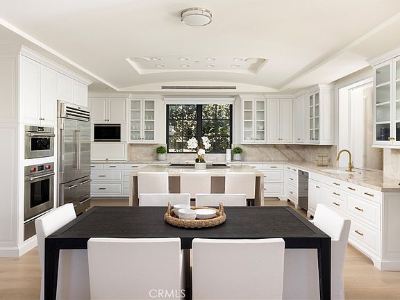At the heart of the home lies a spacious entertainer's kitchen, featuring a generous island, top-of-the-line Wolf and Sub-Zero appliances, and a butler's pantry with abundant storage including an additional refrigerator. Adjacent to the kitchen, the enclosed California Room offers a serene indoor-outdoor living experience with a built-in barbecue, secondary dining and lounge spaces, and folding doors that open to a grassy backyard.