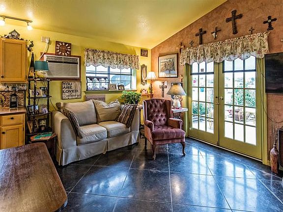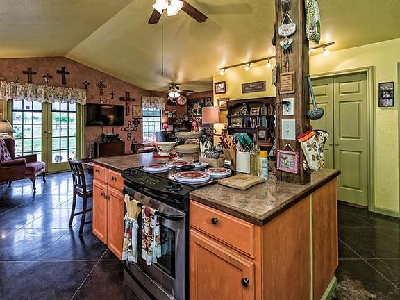Beautiful home barndominium sitting on five acres, Two bedrooms, one bath, open kitchen with over sized island, vaulted ceilings, living area, mud room with storage, drop down attic with storage, car port attached, concrete floor, the car port can occupy a motor home and has a three side enclosure, detached workshop, small orchard, established flower beds, electric fence, property is fenced on three sides, refrigerator stays.