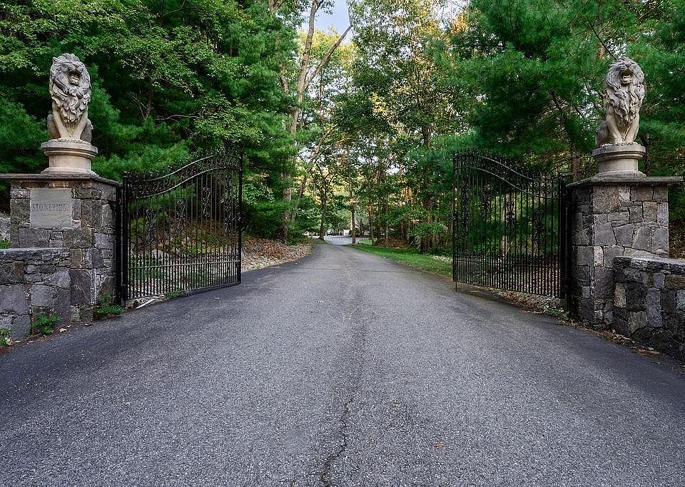 Slate and stone fireplacePool houseLandscaped patiosGated drivewayTuscan-style brick homeFinished basementFamily room