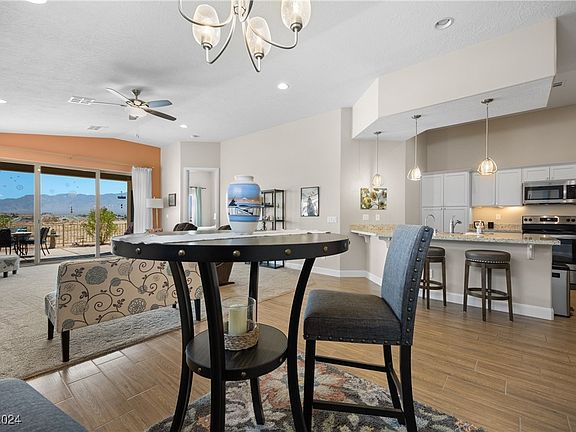This lovely 3 bed & 2 bath Townhouse is located in one of the most prime spots at Hilltop Vistas to offer you unobstructed views looking East to capture not only the Virgin Mountains, but Mesquite Valley, golf courses, the Virgin River & so much more! The patio view starts with morning Sunrises and ends with gorgeous sunset shadows, making it one special place to retreat. Inside you'll find wood-plank like tile through the main areas, with carpet in the bedrooms and living room, vaulted ceilings, gorgeous white kitchen cabinets with stainless hardware as well as Stainless steel appliances and under cabinet lighting, granite countertops and beautiful light fixtures. Other upgrades include 8' doors, 12' sliding glass doors to the patio, patio privacy walls, tiled walk in shower in the main bathroom, brand new Bosch dishwasher, new painted front door and a fully fenced pet friendly backyard. Ask about the furniture package!