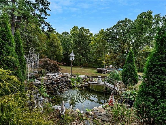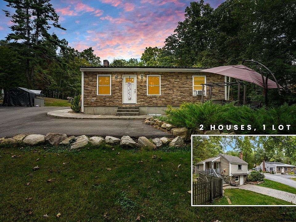 Welcome to your very own hidden escape in Derry. Nestled on 6.5 private acres, this rare property offers two single-family homes on one lot, with the potential for further subdivision (buyer to perform due diligence) The main ranch-style home shines with its spacious and thoughtful layout. The recently added expansion (completed just two years ago) enhances the living space, blending modern updates with comfort. The kitchen stands out with stainless steel appliances, quartz countertops, and a center island perfect for entertaining. Just off the kitchen, you’ll find a separate dining room, which opens into a large living room with vaulted ceilings - a stunning space created by the addition. Classic hardwood floors run throughout the main living areas, adding timeless appeal. The finished walkout basement extends the home’s versatility, featuring its own kitchen, dining area, living room, and bathroom, an ideal setup for guests, extended family, or potential rental income. The bungalow-style home offers cozy charm with 2 bedrooms, 1 bathroom, and a comfortable eat-in kitchen, providing the perfect option for multi-generational living, guest accommodations, or a rental opportunity. Step outside to enjoy the private grounds. The yard has been thoughtfully cleared and is ready for use, featuring an above-ground pool, a peaceful koi pond, a gazebo, and a towering pine tree just waiting to be lit for the holidays. Sale subject to seller finding suitable housing. Welcome home!
