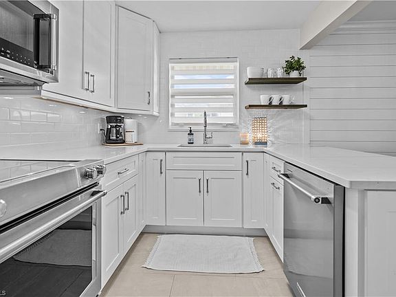 Incredible investment opportunity in a PRIME Naples location! Just 2 miles from the beaches and iconic 5th Avenue, this beautifully updated Coastal Chic 2-bedroom, 2-bath home with a private garage offers a bright, open living space. This property has been thoughtfully upgraded with a new roof (2022), new brick-paver driveway, HVAC replaced in 2022, and full hurricane protection including impact glass, 12-foot sliding doors, and hurricane-rated front and garage doors. The lanai features motorized privacy shades, and a retractable screen on the front door allows for breezy indoor-outdoor living. Inside, the kitchen boasts flat-panel cabinetry, soft-close drawers, slide-out shelving, upgraded island and pantry panels, and KitchenAid stainless appliances. Additional high-end touches include upgraded 18x36 tile flooring, Karastan carpeting, solid wood 3-panel doors, chrome hardware, 6-inch baseboards, shiplap accent walls, and custom closet organizers throughout. With its unbeatable location, premium finishes, and low-maintenance upgrades, this property is move-in ready and an exceptional investment property for seasonal renting, full-time living, or a high-demand vacation rental.