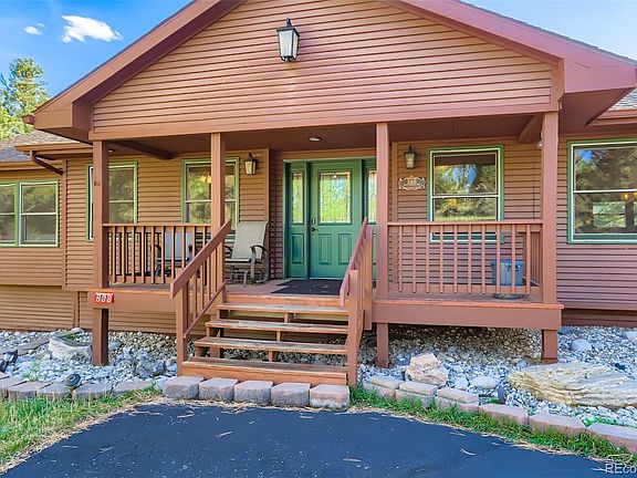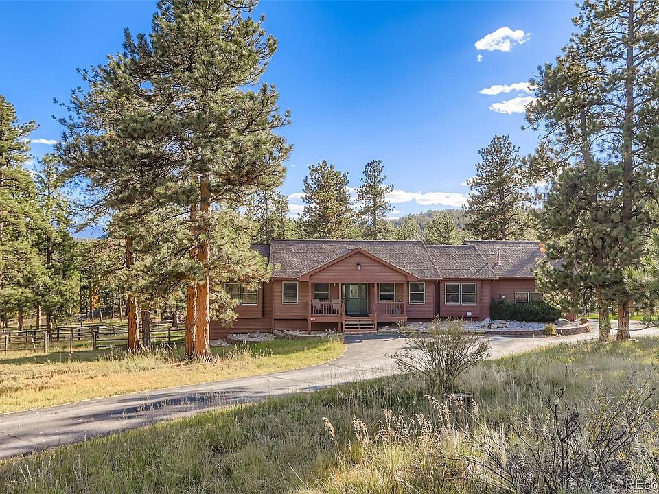Meticulously maintained and beautifully renovated walk-out ranch in Mill Iron D Estates on 2 fenced, fire-mitigated acres with peaceful mountain views and wildlife. This light-filled open-concept home features an expanded main level, stunning stone fireplace with granite accents, new cabinetry throughout, and a bright country kitchen with ceramic tile and added lighting. Luxury vinyl flooring spans the main areas, with new carpet in all bedrooms. Bathrooms have been fully remodeled, including an enlarged lower bath. Updates include new wood stairs, ceramic tile in the basement, remodeled laundry room, nearly all new interior and closet doors, upgraded lighting throughout, fresh interior and exterior paint, and a new front entry door. Enjoy new front and rear decks with added lighting and concrete base, enclosed dog run, oversized 3-car garage, owned solar system, hot tub, transferable 50-year roof, high-efficiency furnace and water heater, skylights, and quick access to Denver, shopping, dining, and world-class skiing. Move-in ready mountain living with modern upgrades throughout. Currently operated as a short-term rental. Seller may consider conveying the property fully furnished and with existing future bookings for a buyer interested in continuing the short-term rental use, subject to terms and agreement.