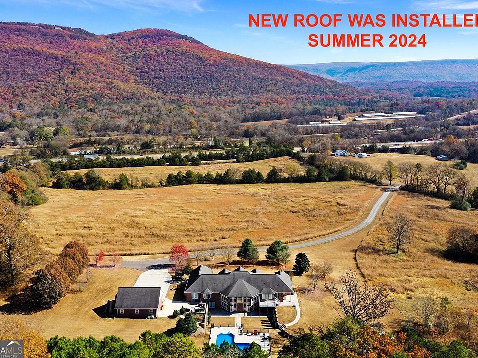 REDUCED! NEW ROOF WAS INSTALLED JUNE 2024. Make this 47.75 +/- acres with excellent views of Lookout Mountain your private retreat ideal for entertaining or a large family with open land, timberland and a 5 bedroom, 3 and one half bathroom four sided brick home with approximately 6,384 square feet and a pool. This property is approximately 30 minutes from Chattanooga, Tennessee. This home offers 3 fireplaces with gas logs, large great room with fireplace and a wall of windows on the rear of the home; open kitchen with double ovens, island, warming drawer, breakfast area ,and opens to the keeping room with fireplace and access to upper patio; large dining room; activity room; large laundry room; master suite with private patio, his and her closets, double vanities, separate tub, and shower with dual shower heads; 4 of the 5 bedrooms provide outside access for fire safety. Downstairs you will find a media room with wet bar and the third fireplace; game room (currently housing a pool table); and a bedroom with a full bathroom. Walk outside from the terrace level and you find a covered porch, and fenced in salt water pool. Additional amenities include a 3 car detached garage. Approximately half of the property is open land and would make an excellent area for pasture for horse or cattle. The balance of the land is in a natural mixture of mainly hardwoods with some pines. There is over an estimated 3,400 feet of paved road frontage on 3 roads making this property ideal for future divisions. There is no zoning in Dade County, Georgia. Utilities: power, Dade County Water, and telephone. Gas provided via a propane tank. Year Built: 2004. Topography: Rolling to Gently Rolling. 29 miles from Chattanooga, Tennessee 128 miles from Atlanta, Georgia 121 miles from Birmingham, Alabama