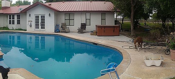Paradise in the desert. Small home on 15 acres 3.5 of which have 30 plus mature trees ( including Pecan, Live Oak, Red Oak). Large 25X45X9 foot pool and 6 person hot tub. Large Barn with covered parking for four vehicles and covered RV parking with all amenities. Paved circular driveway from road to and around barn. Sprinkler system for yard. Good private well. Fireplace. Granite counters and new inside shutters add to the comfort of this home. Large screened in porch for enjoying those lazy evenings.