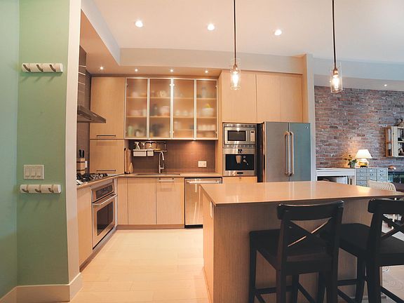 Brick feature wallGround-floor patioModern kitchen layoutBuilt-in coffee machineAmple workspace
