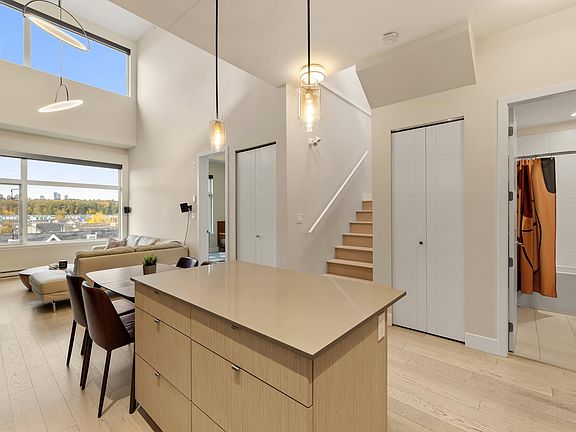 Loft style living in Queensborough? Welcome to Portage, and this uber chic 2 bed, 2 bath top floor loft-style home with just under 1100 sqft of living space and huge entertainer’s rooftop deck overlooking Annacis Channel. Experience the wow factor of a floor to ceiling brick feature wall, 18’ vaulted ceilings and views of the North from your living room, open concept kitchen w/ quartz counters, gas cook-top, SS appliances, and neutral colour palette. Main floor bedroom features high ceilings and walk-in closet w/ built-ins. Primary bedroom upstairs features 3pc ensuite w/heated floors, another walk in closet w/built-ins and bifold doors opening up to your 300sqft rooftop deck. With 2 parking and a storage locker, don’t wait! Close to Port Royal Park, Shopping, and elementary/middle schools