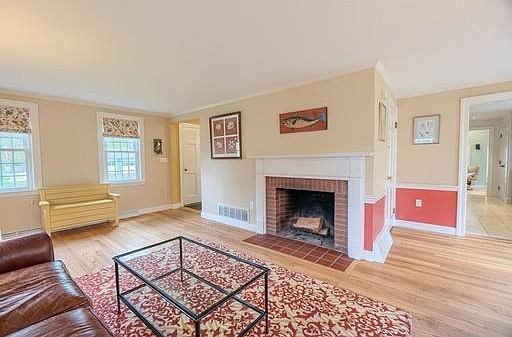 Welcome to this cheerful cape with picturesque stone wall bordering the front yard and driveway. First floor features combination living / dining room, with fireplace and French doors that open to the deck and backyard with mature flowering trees and shrubs. Kitchen features custom cabinetry with Bosch gas cook top, wall oven, built in microwave, granite counters and double pantry. The family room showcases cathedral ceiling, built in shelving, newly finished, wide plank, hardwood floor, bay window and wood stove. The first-floor bedroom is centrally located to the full bathroom and is currently being used as an office. Upstairs there are two good size bedrooms with hardwood floor and the second full bath featuring air jet tub. Improvements include young windows, roof approx. 2008, young gas furnace, electric panel upgrade, and central air. Brand new septic system to be installed prior to closing. Ideal commuting location with access to the train, schools and shopping. Don't miss out!