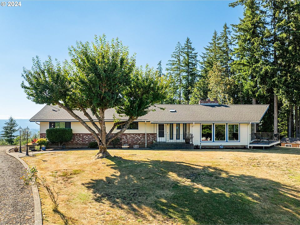 Dream home nestled on over 5 acres in the serene and pastoral setting of Castle Rock. This pristine property offers breathtaking panoramic views of Mt. Rainier and the valley. The residence boasts vaulted ceilings with exposed wood and beams, creating an airy and spacious feel throughout. Chef’s kitchen features quartz countertops, island, stainless steel appliances, a double oven, and an inviting eating area with a slider leading to the deck. The vaulted formal dining room, complete with a fireplace, offers a perfect setting for entertaining. The vaulted living room is filled with natural light from large windows that frame stunning mountain views. Primary retreat with double closets, private bathroom, and slider to deck. The lower level offers a large family room with a double-sided fireplace, a bar, a fourth bedroom, an exercise room, and a convenient laundry room with a laundry chute. Outside, find a wrap-around deck that overlooks the mountains and valley, perfect for relaxing and soaking in the views. The property also features a hot tub, a fully fenced 80x40 garden, three tranquil ponds, and a pump house, plus 35x16 work shed with power. Additional features include a Kinetico water system, tankless and instant hot water, oversized garage, and a large parking pad with room for RV parking.