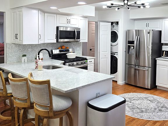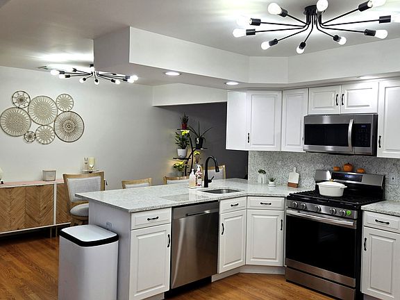 - Modern kitchen complete with new stainless steel appliances, new Quartz countertops and sink, new cabinet paint, and a large peninsula/breakfast bar.