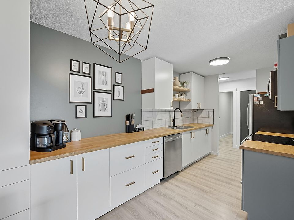 New floorsOpen floor planUpdated white kitchenExtra cupboardsSleek countertopsIn-suite laundrySpacious balcony