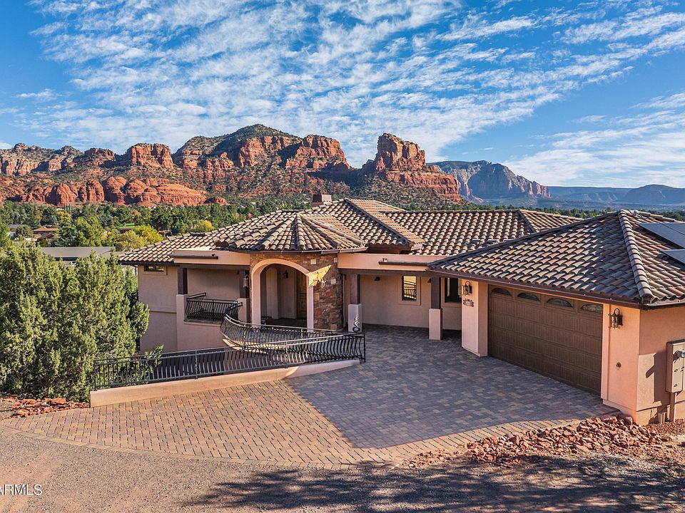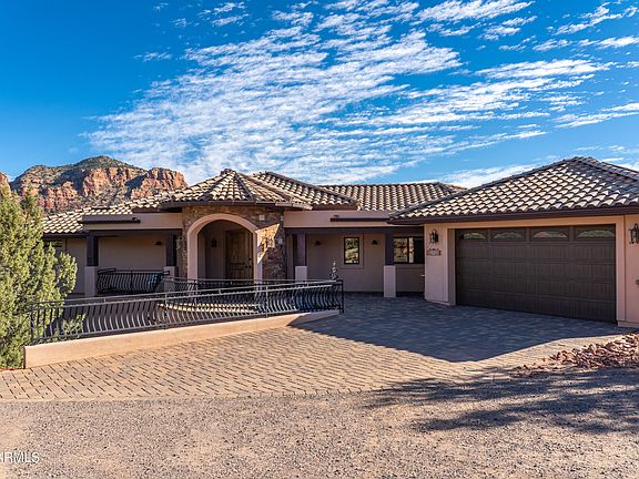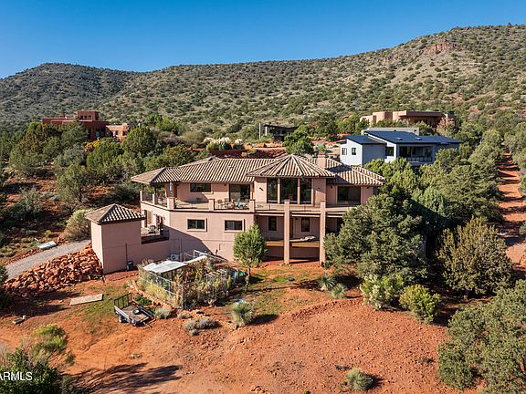 Looking for HUGE RED ROCK VIEWS? Look no further! You can't beat the views from this elevated Sun Up Ranch home in the Village of Oak Creek. Spacious, expansive views from this spacious home with large rooms and wrap-around decks. Main living on the upper level - LR, Dining, Kitchen and Primary Suite. Lower lever has two more bedrooms, office space and an enormous theatre! Large shop/ third garage bay. Pottery studio with sink and kiln room, plus fire-resistant out-building for gas-fired kiln. All this on 1.07 Acre lot. Plenty of room to add a pool or extensive gardens. The sky is the limit with this home in a metes and bounds area of the Village. Septic appears to be for 5 Bedroom home. Perfect primary home, or potential STR!