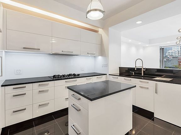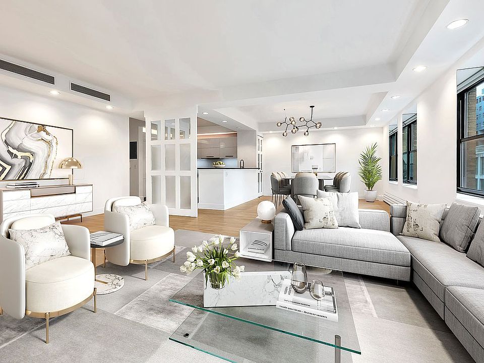 The open concept kitchen is seamlessly integrated into the living space. Sleek granite-topped white lacquer cabinetry surrounds top-of-the-line Miele appliances. Framing views over Tribeca Park, the living area spans 40 feet, an open, airy space ideal for formal entertaining or quiet relaxation.
