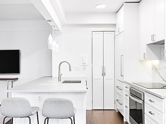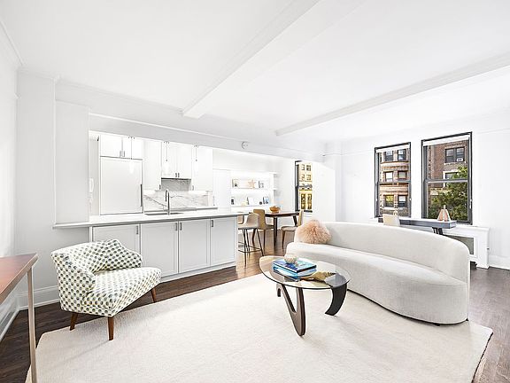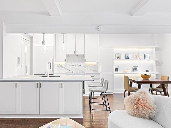 This mint co-op has a gracious entry foyer that leads to the sunny living room and a dining area with custom shelving. The sleek open kitchen has top appliances including an induction stove, dishwasher, a marble backsplash, Caesarstone countertops, custom cabinets, a pantry closet, and a breakfast bar.