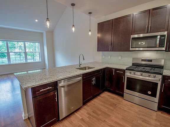 Beautiful end-unit townhouse apartment located right in the Village of Goshen! Two bedroom, two full bathroom unit with cathedral ceilings and a large 370sqft loft with elevated views of the Heritage Trail adjacent to the rear of the property. This specific loft end unit #15 is located at the western end of the property with extra windows on the west side of the building on the main floor and loft levels providing for extra light and beautiful views. Living area with large windows provide excellent views from the second floor elevation. Hardwood floors throughout the unit. Kitchen with granite countertops, quality cabinetry, stainless steel appliances, natural gas stove-top and oven. Washer and dryer located in each unit. Central air conditioning and forced air heating. Tall ceilings and bright windows. Assigned parking. Pet friendly community. Convenient to the highway and future supermarket and a short walking distance to the restaurants and local shops of Goshen. There will be a credit/criminal background check will cost $20 per adult. Tenants to pay their own gas, electric and water bill. Parking will cost $50/month for the first car and $75/month for each additional vehicle. Tenant to pay due at lease signing: 1st month rent, One month security deposit, and one month brokerage fee. Call listing agent for more details.