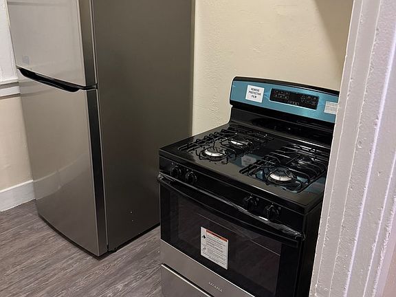 Kitchen appliances: Stainless steel refrigerator, stove.